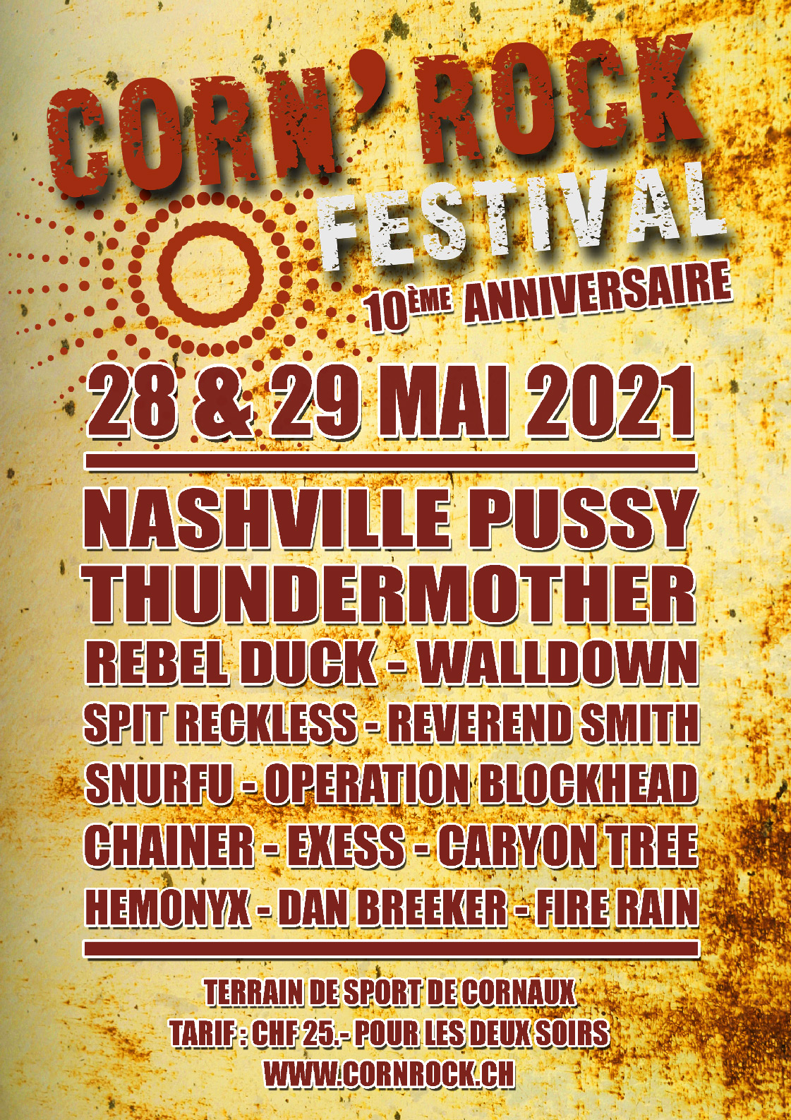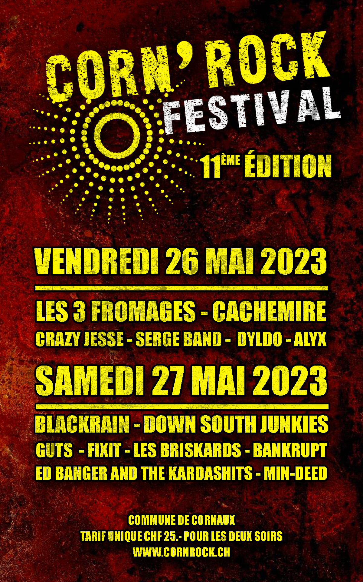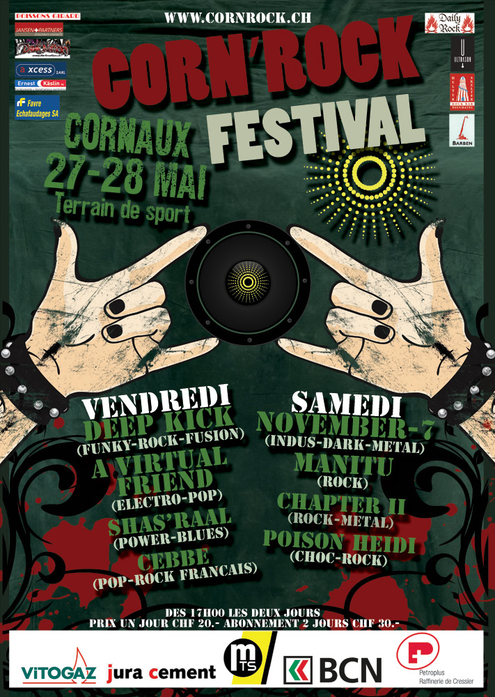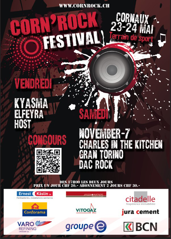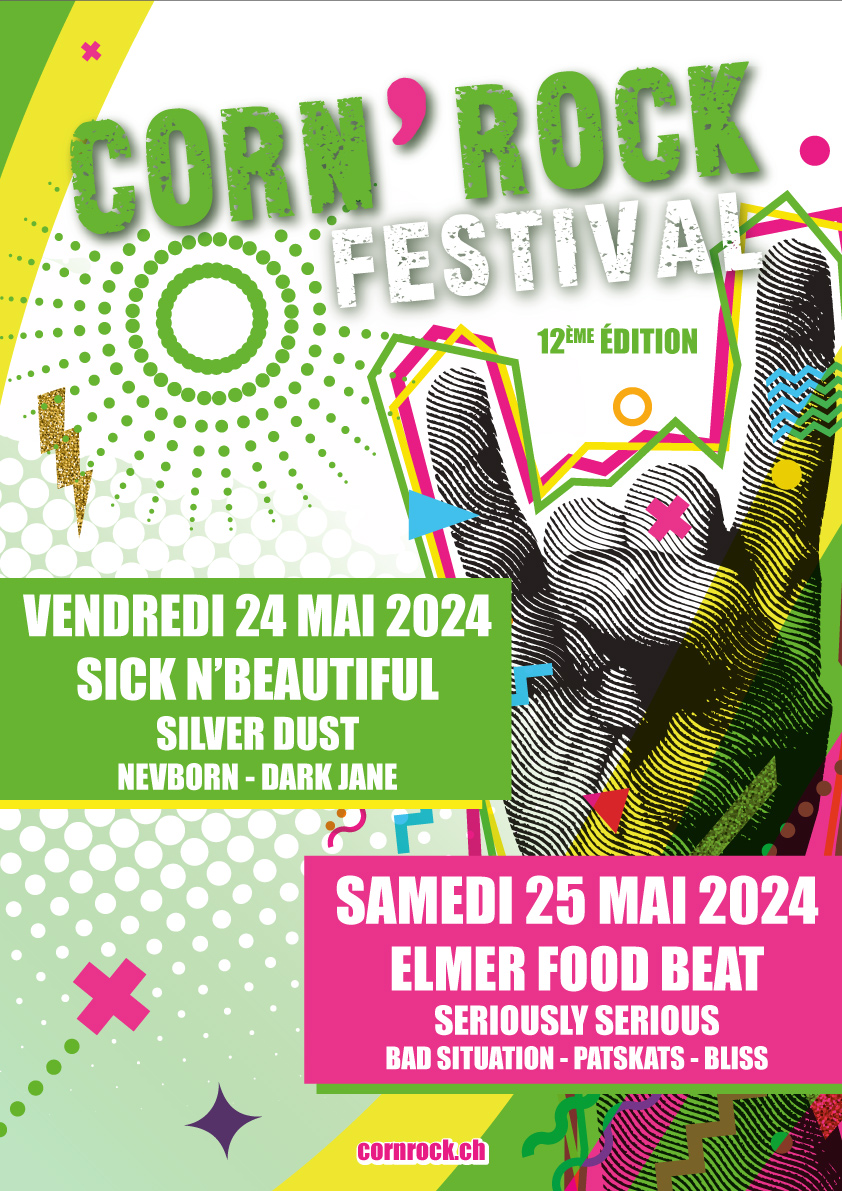 Découvrez toutes les affiches officielles du Corn’Rock Festival ! Plongez dans l’histoire du festival à travers les visuels des éditions précédentes, de la première à aujourd’hui. Chaque affiche retrace l’ambiance unique de son année et illustre l’évolution de l’événement à Cornaux (NE).