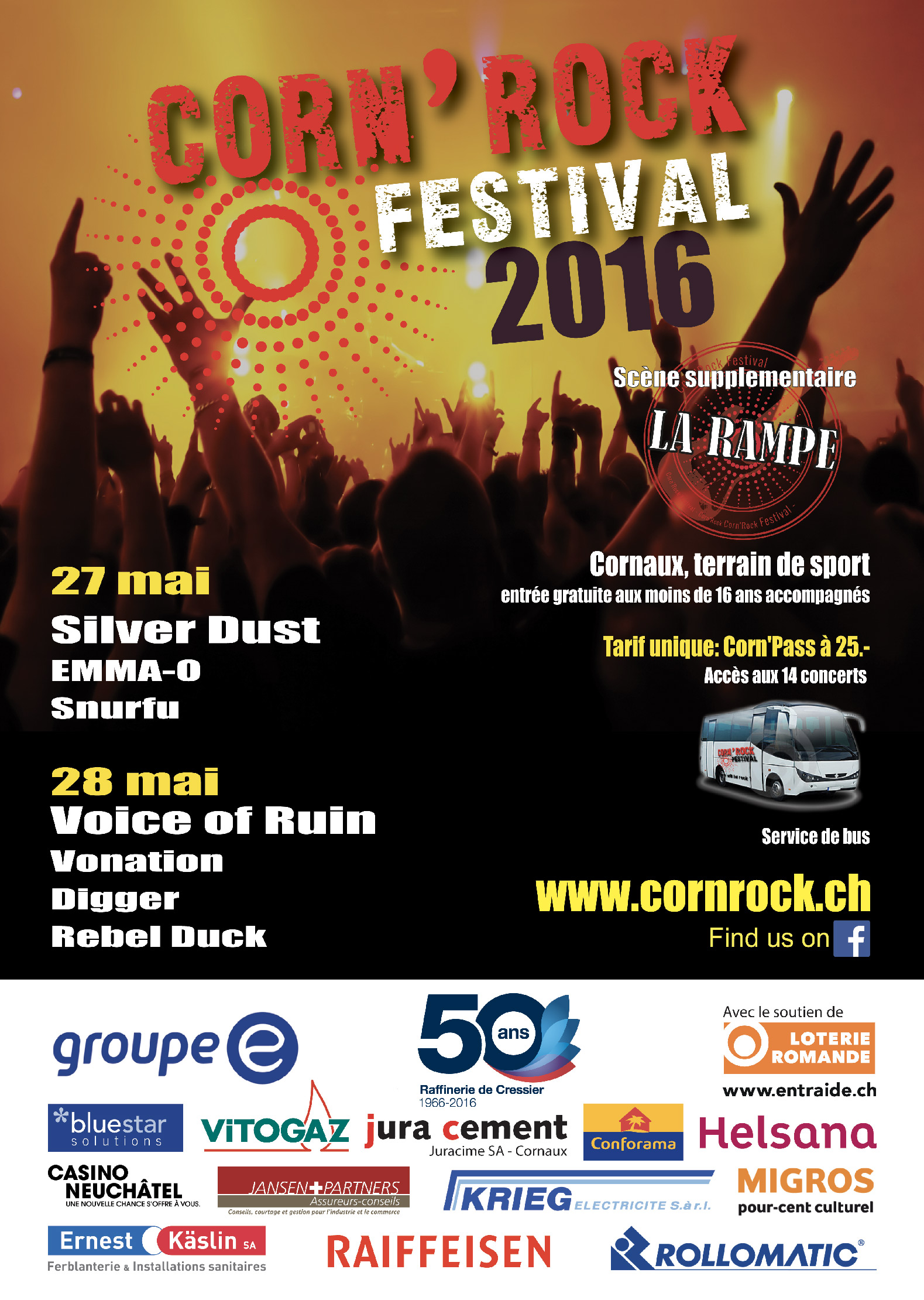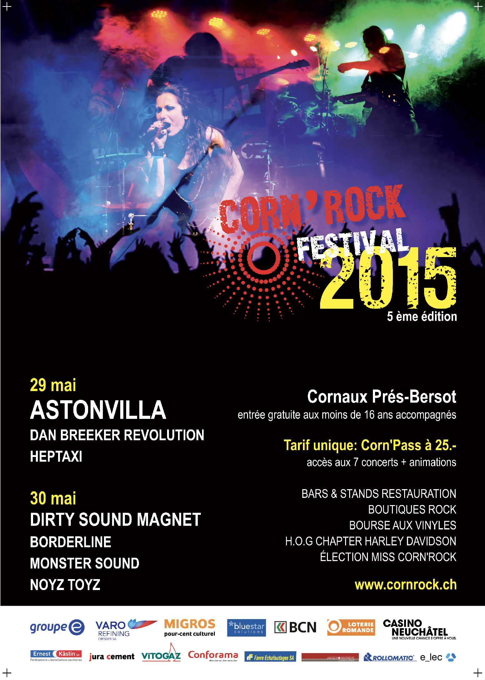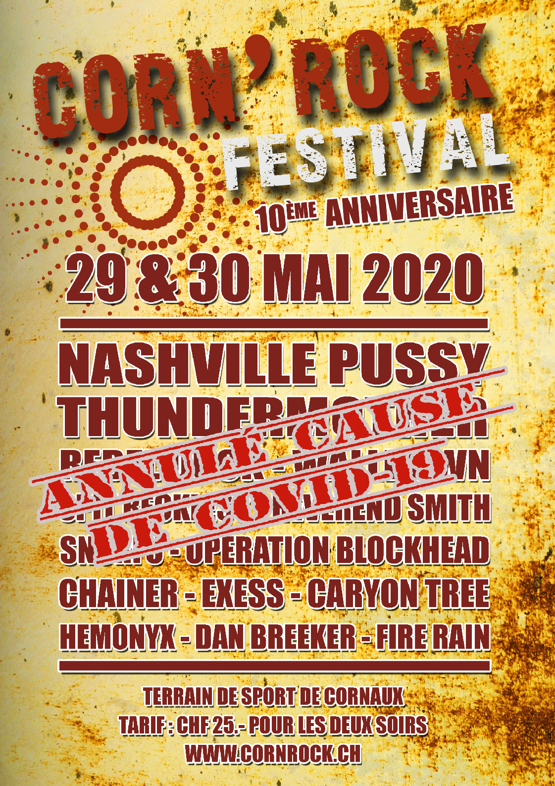 Découvrez toutes les affiches officielles du Corn’Rock Festival ! Plongez dans l’histoire du festival à travers les visuels des éditions précédentes, de la première à aujourd’hui. Chaque affiche retrace l’ambiance unique de son année et illustre l’évolution de l’événement à Cornaux (NE).