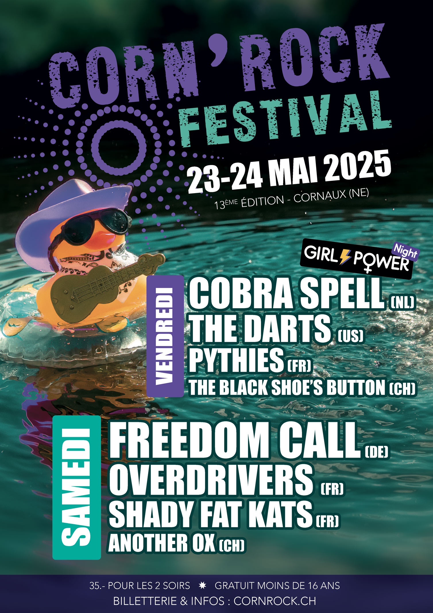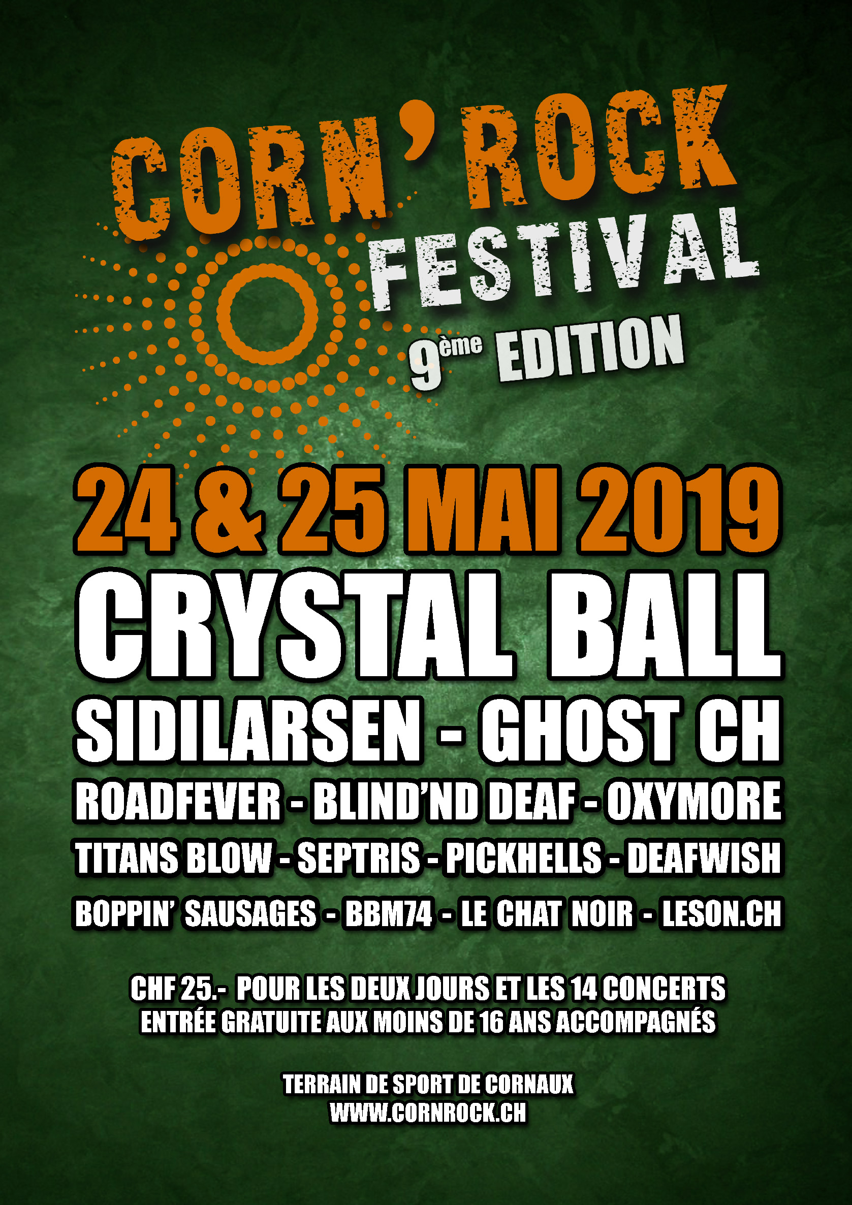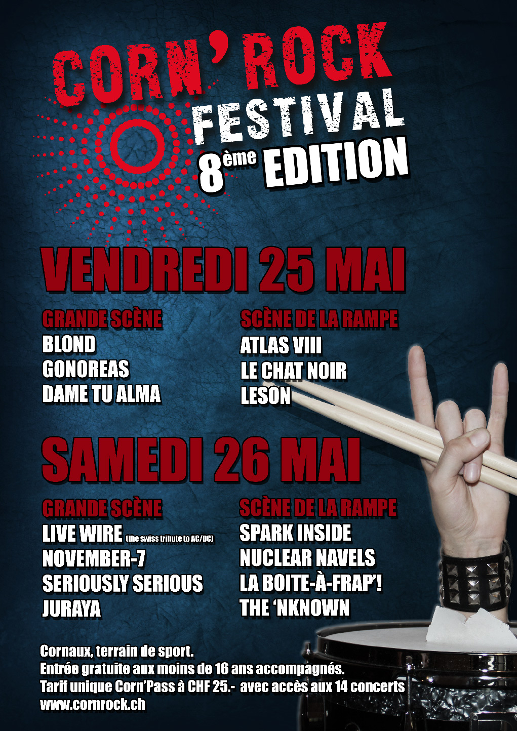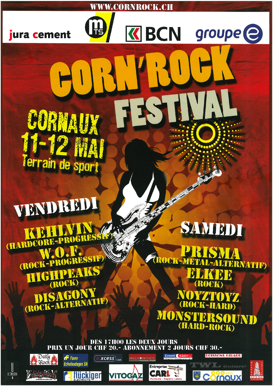 Découvrez toutes les affiches officielles du Corn’Rock Festival ! Plongez dans l’histoire du festival à travers les visuels des éditions précédentes, de la première à aujourd’hui. Chaque affiche retrace l’ambiance unique de son année et illustre l’évolution de l’événement à Cornaux (NE).